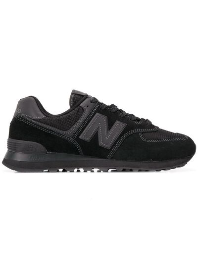 Black leather 574 sneakers from New Balance featuring a round toe, a logo patch at the tongue, a lace-up front fastening, a signature N patch to the sides, branded heel counter and a rubber sole.