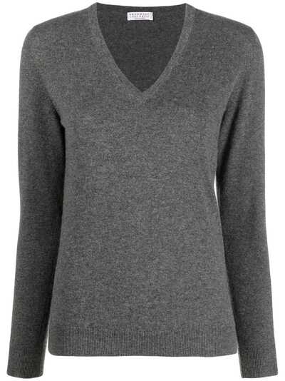 V-neck cashmere jumper from BRUNELLO CUCINELLI featuring grey, cashmere, knitted construction, V-neck, long sleeves, straight hem and ribbed trim.