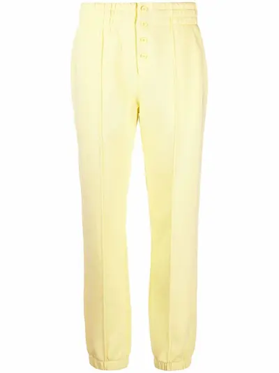 yellow cotton embroidered logo to the front elasticated waistband front button fastening two side slit pockets rear patch pocket elasticated ankles