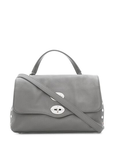 Postina leather tote from ZANELLATO featuring beluga grey, calf leather, pebbled texture, foldover top, clasp fastening, single shoulder strap, single rounded top handle, main compartment, internal zip pocket, internal logo patch and suede lining.