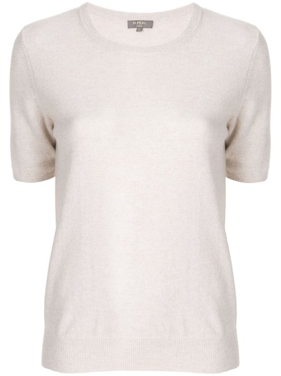 Oatmeal cashmere round neck T-shirt from N.Peal featuring short sleeves, a relaxed fit and a ribbed hem.