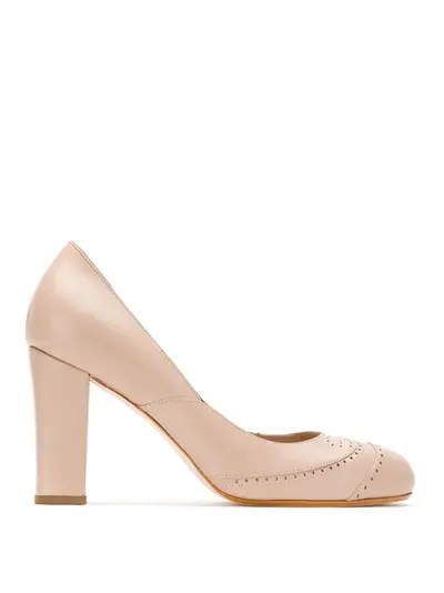 Nude pink leather panelled pumps from Sarah Chofakian featuring an almond toe and a high block heel.