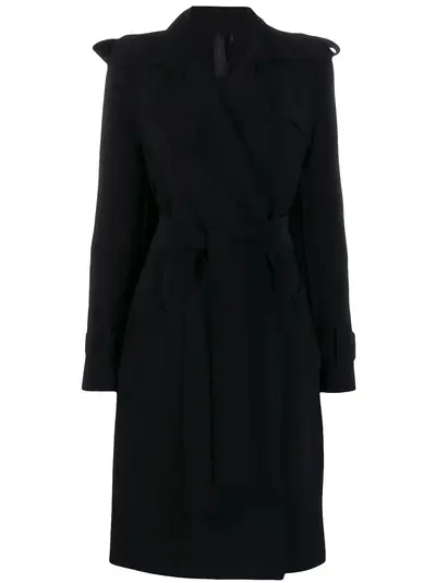 Black belted trench coat from Norma Kamali featuring a classic collar, long sleeves, a belted waist, a mid-length and a slim fit.
