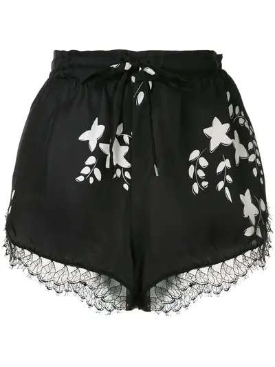 Black silk St Clair shorts from MacGraw featuring an elasticated waistband, a floral print and a scalloped lace hem.