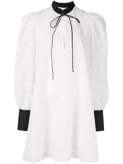 Ivory cotton lace design dress from MacGraw featuring a tie fastening, long sleeves, fitted cuffs and a short length.