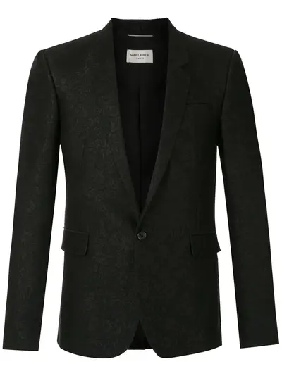 Ready for your next formal occasion? The best way to be prepared is with this black floral jacquard single-breasted blazer from Saint Laurent. Suited and booted. Featuring notched lapels, a front buckle fastening, long sleeves, flap pockets and a curved hemline.
