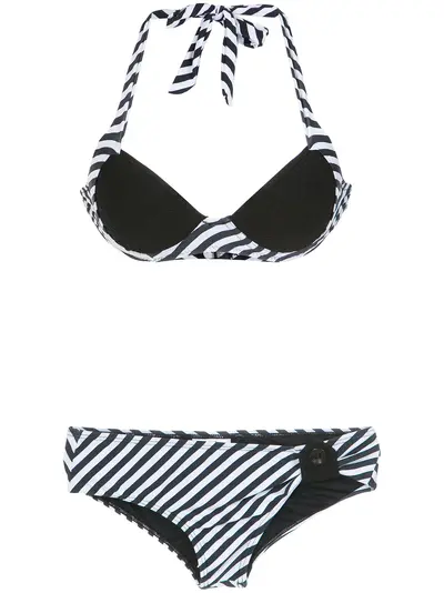 Black and white striped bikini set from Amir Slama featuring a halterneck top, a back tie fastening and a lining. Swimwear must be tried on over your own garments. This item is true to fit. Please note this item has a brazilian cut.