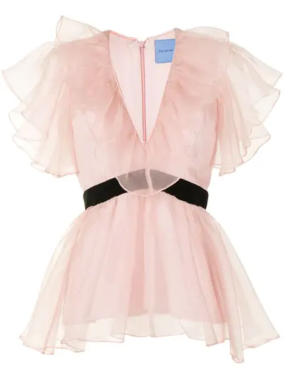 pink silk tulle overlay frilled short sleeves V-neck peplum waist velvet waistband concealed rear zip fastening