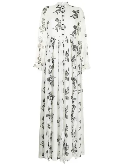 white/black silk all-over rose print ruffled detailing stand-up collar front button placket long sleeves flared hem
