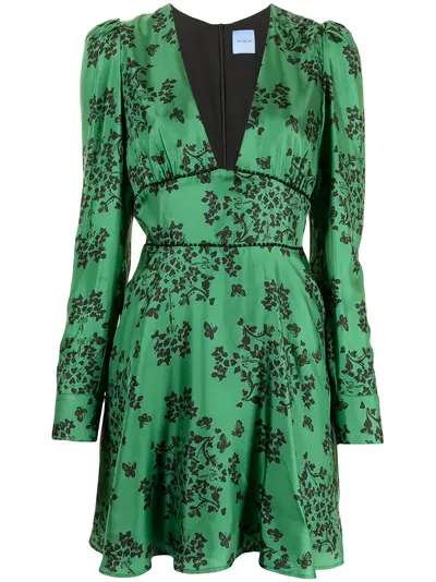 black/green silk butterfly print pleat detailing plunging U-neck concealed rear zip fastening long puff sleeves flared hem