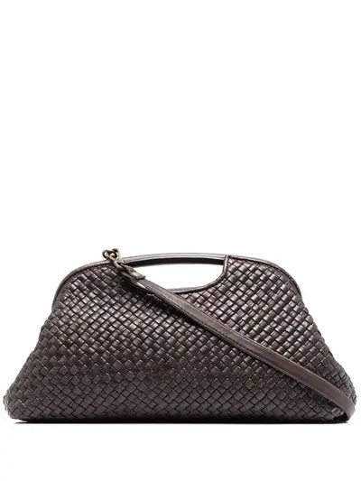 dark brown leather interwoven design flat top handles main compartment removable pouch adjustable detachable shoulder strap