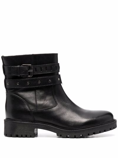 black leather silver-tone stud detailing decorative buckle detail almond toe side zip fastening ankle-length branded insole low ridged heel ridged rubber sole