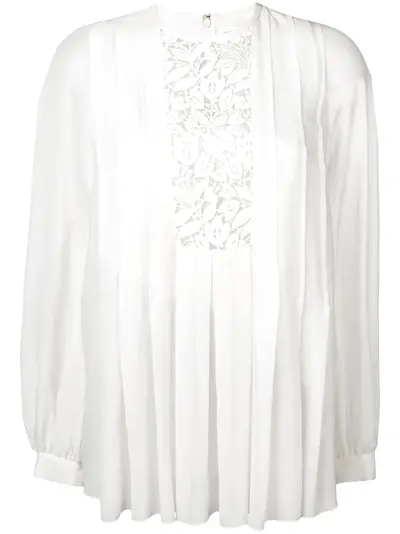 White silk and cotton blend front lace blouse from Giambattista Valli featuring a round neck, long sleeves and a straight hem.