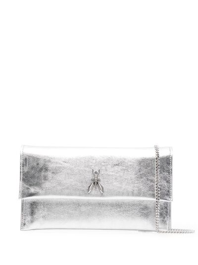 silver leather silver-tone hardware metallic effect foldover top chain-link shoulder strap main compartment