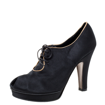 Fendi Black Satin Platform Peep Toe Lace Up Ankle Booties Size 37 335916 (чёрный, lpn14359960)