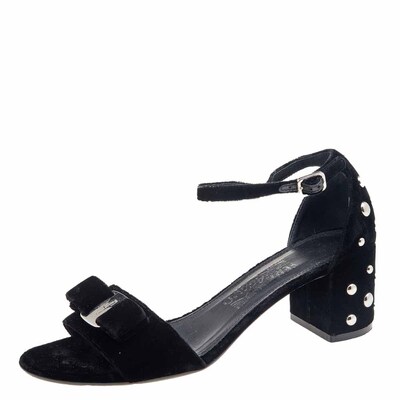 Salvatore Ferragamo Black Velvet Studded Block Heel Ankle Strap Sandals Size 38 612659 (чёрный, lpn14379119)