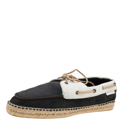 The black and white contrast enhances the appeal of these Giorgio Armani Boat shoes. Exquisitely crafted from nubuck leather on the exterior, they have a braided midsole, lace up vamp, and silver tone hardware. The jute insole and rubber sole make it a functional pair.