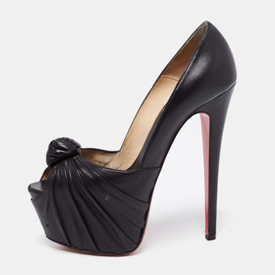 Set on towering heels and crafted with skilled perfection, these Lady Gres pumps from Christian Louboutin are here to elevate your style and take it a few notches higher They are created using black leather and feature peep toes, thick platforms, and tall heels. The signatory red lacquered soles beautify them further.