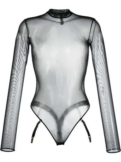 black stretch-design mesh panelling long sleeves mock neck thong style one-piece design Just a reminder that this piece must be tried on over your own garments.