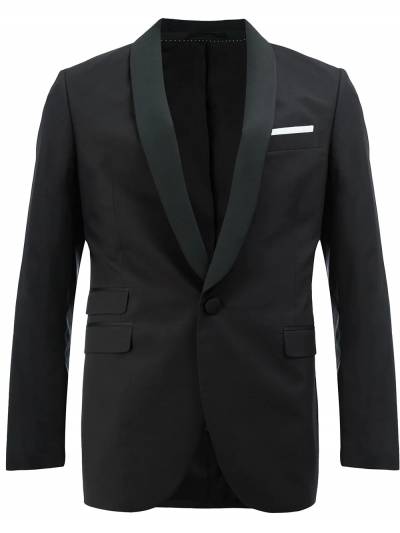 Dress for the occasion in this sleek black cotton blend suit jacket from Neil Barrett's latest collection. Sharp and sophisticated, this classic suit jacket features a shawl lapel, side pockets, a front button fastening, structured shoulders, a chest pocket and a curved hem.