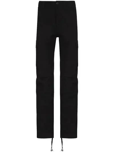 black cotton belt loops front button and zip fastening two side cargo pockets two rear flap pockets drawstring cuffs straight leg logo patch to the rear