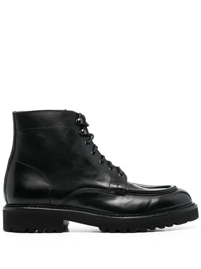 jet black calf leather ankle length round toe front lace-up fastening branded insole ridged rubber sole