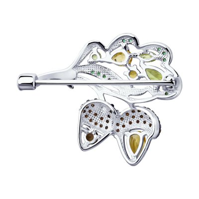 Изумительная серебряная брошь, живо передающая краски осеннего леса, украсит однотонное пальто, свитер, платье или сумку. Богатый декор из шоколадных раухтопазов, зелёных хризолитов и фианитов, а также ярких жёлтых цитринов придаёт украшению особую выразительность. Такой эффектный аксессуар – отличная идея для подарка, но так хочется оставить его себе!