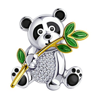 С этой очаровательной брошью у плохого настроения нет шансов! Забавный панда заставит улыбнуться даже самым хмурым утром. Просто украсьте им платье, джемпер или жакет и готовьтесь весь день получать комплименты. Цветная эмаль и фианитовая обсыпка искусно передают природный окрас медвежонка, а безупречный родаж добавляет фигурке блеск и объём. Учтены все детали! Даже бамбуковая веточка выделена изящным золочением. Такое неординарное украшение – стильный акцентный аксессуар и замечательный подарок.