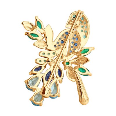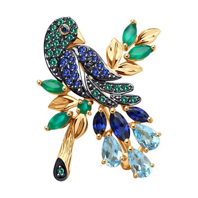 Роскошный какаду предстал во всём великолепии своего живописного оперения. Благодаря агатам, топазам, сапфировым корундам и цветным фианитам золотая брошь выглядит сочно и выразительно, позволяя создавать оригинальные и запоминающиеся модные образы. Крепите драгоценную птичку к осеннему пальто, летящему весеннему платью и даже летней соломенной шляпе – настроение обеспечено!