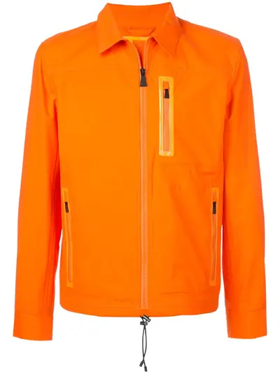 Orange Ajax rain jacket from Aztech Mountain featuring a spread collar, a front zip fastening, a zipped chest pocket, zipped side pockets, long sleeves, button cuffs and a drawstring hem.
