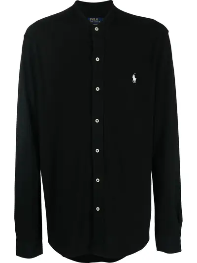 jet black cotton signature Polo Pony motif band collar front button fastening long sleeves curved hem