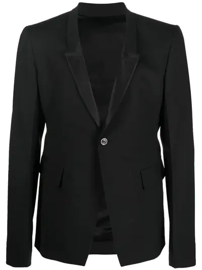 black virgin wool peak lapels front button fastening long sleeves straight hem two side flap pockets