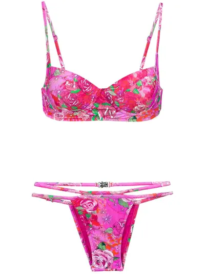 Pink rose print bikini set from Amir Slama featuring a top with spaghetti straps, an all-over print, a thong style bottom with a lining, a buckle fastening and a back fastening. This item is true to fit. Please note this item has a brazilian cut.