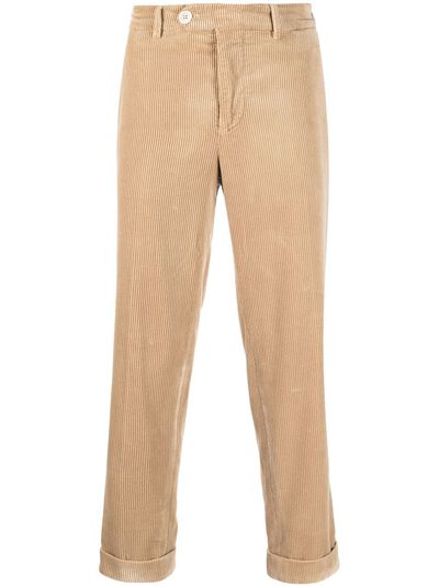 beige cotton corduroy front button fastening belt loops two diagonal pockets to the sides two rear welt pockets rolled cuffs