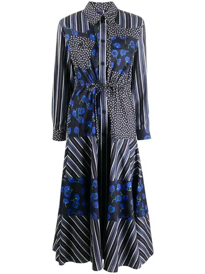 navy blue cotton mix print classic collar long sleeves front button fastening fitted waistline A-line skirt below-knee length