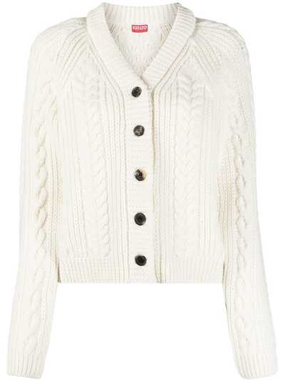 ecru wool cable knit V-neck front button fastening long sleeves straight hem