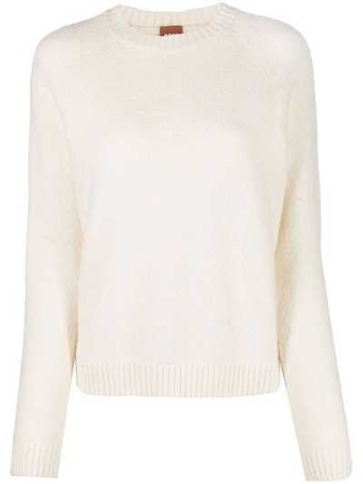 cream white knitted construction crew neck long sleeves ribbed cuffs ribbed band collar gold-tone logo plaque