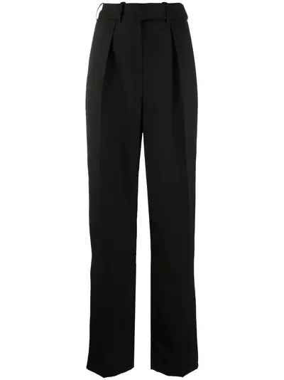 black wool high waist belt loops hook and zip fly fastening side pouch pockets pleat detailing rear welt pocket straight leg