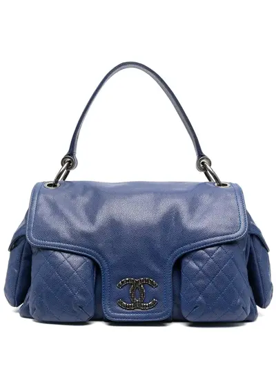 circa 2009-2010 purple calf leather diamond quilting signature interlocking CC logo foldover top with magnetic fastening single rounded top handle two side cargo pockets two front pouch pockets internal logo patch internal zip-fastening pocket full lining gunmetal-tone hardware rectangle body Serial Number: 13345984 Condition: GOOD. This previously owned and used item is in good condition with minimal signs of use. This may include fading of material or plating and scratches.