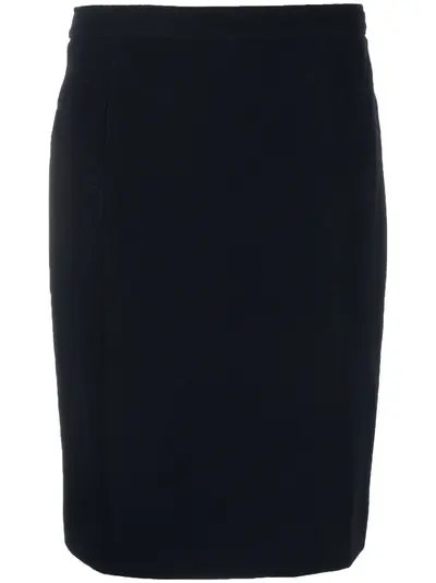 circa 1990s black wool pencil design mid-rise side button and zip fastening knee-length straight hem silk lining Condition: GOOD. This previously owned and used item is in good condition with minimal signs of use. This may include fading of material or plating and scratches.