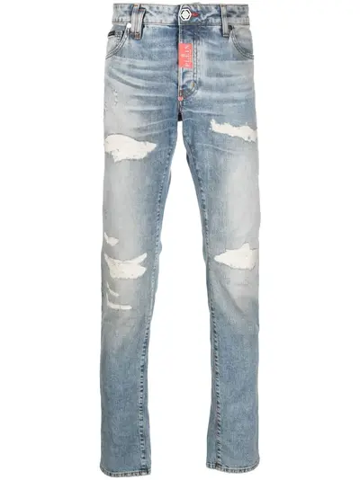 light blue stretch-cotton distressed finish mid-rise concealed front fastening classic five pockets straight leg