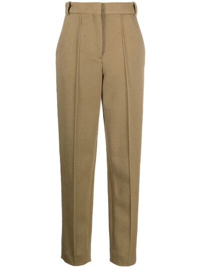 ash green wool blend tailored cut tapered leg high-waisted pintuck detailing concealed front fastening belt loops two diagonal pockets to the sides rear welt pocket