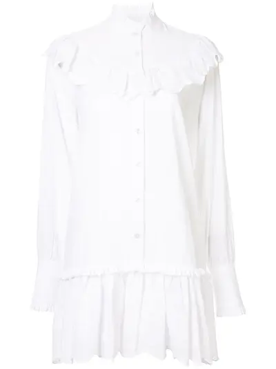 White cotton Fable dress from MacGraw featuring a ruffled neck, a front button fastening, long sleeves, a scalloped hem and a short length.
