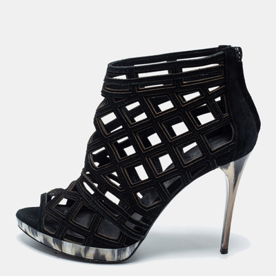 Theres too much gorgeousness in these Burberry booties Crafted from suede, these black booties feature a peep toe silhouette and flaunt a cutout design on the uppers They come equipped with back zippers, platforms, and 11cm stiletto heels.