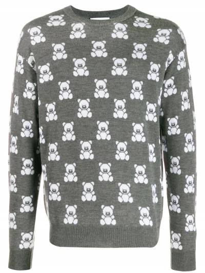 grey wool patterned intarsia knit crew neck long sleeves ribbed cuffs ribbed hem