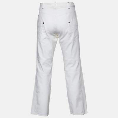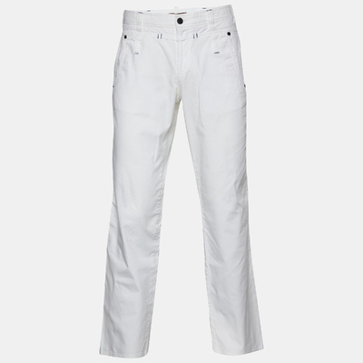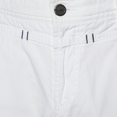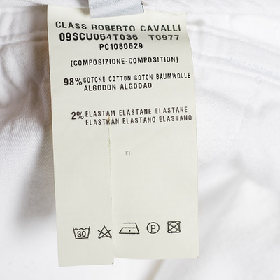 Look stylishly neat as you wear these trousers designed by Class by Roberto Cavalli. They are tailored using white cotton fabric into a straight leg fit. They are equipped with a zipper closure and have five pockets. Style these trousers with your favorite T shirt and sneakers.