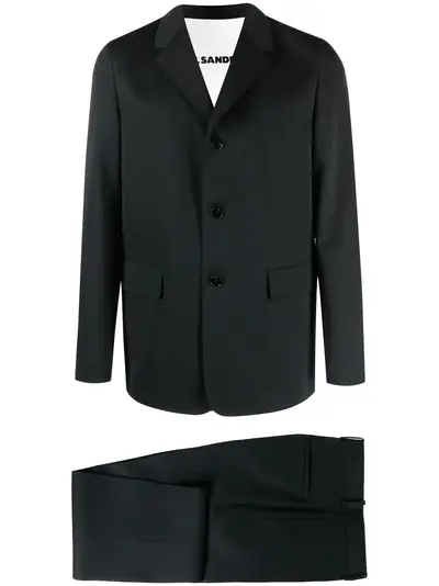 jet black wool-cotton blend Blazer: classic lapels front button fastening long sleeves two front flap pockets Trousers: belt loops concealed front fastening two side inset pockets two rear welt pockets