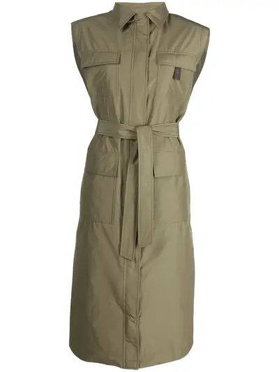 military green cotton blend two side flap pockets belted waist concealed front fastening pointed flat collar sleeveless mid-length straight hem