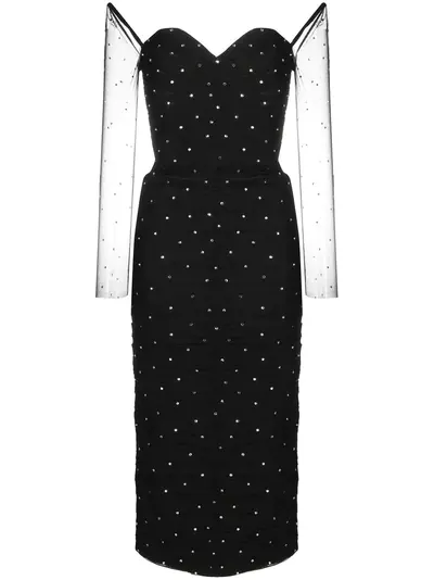 black velvet effect sequin design sweetheart neck rear zip fastening long sheer sleeves tailored cut straight hem mid-length