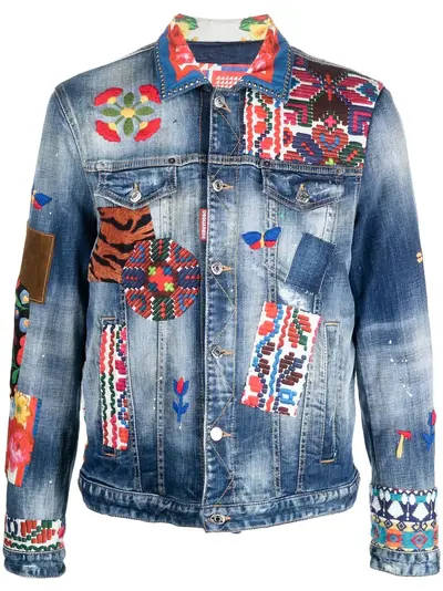 blue/multicolour stretch-cotton embroidered design patch detail classic collar two chest flap pockets front button fastening slip pockets to the sides straight hem